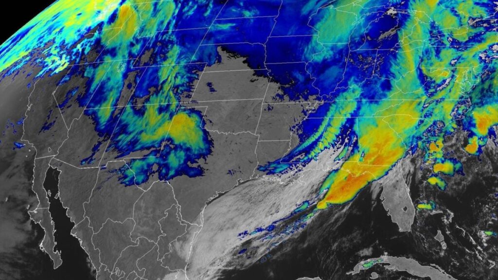 Alors que le cyclone progresse sur les Grands Lacs, une puissante masse d’air froid va balayer l’Est. The combination of vigorous dynamics ahead of the potent front and the maximum daytime heating will be ripe for the eruption of severe weather, especially across the interior Mid-Atlantic late Monday afternoon into early evening, a déclaré le NWS.